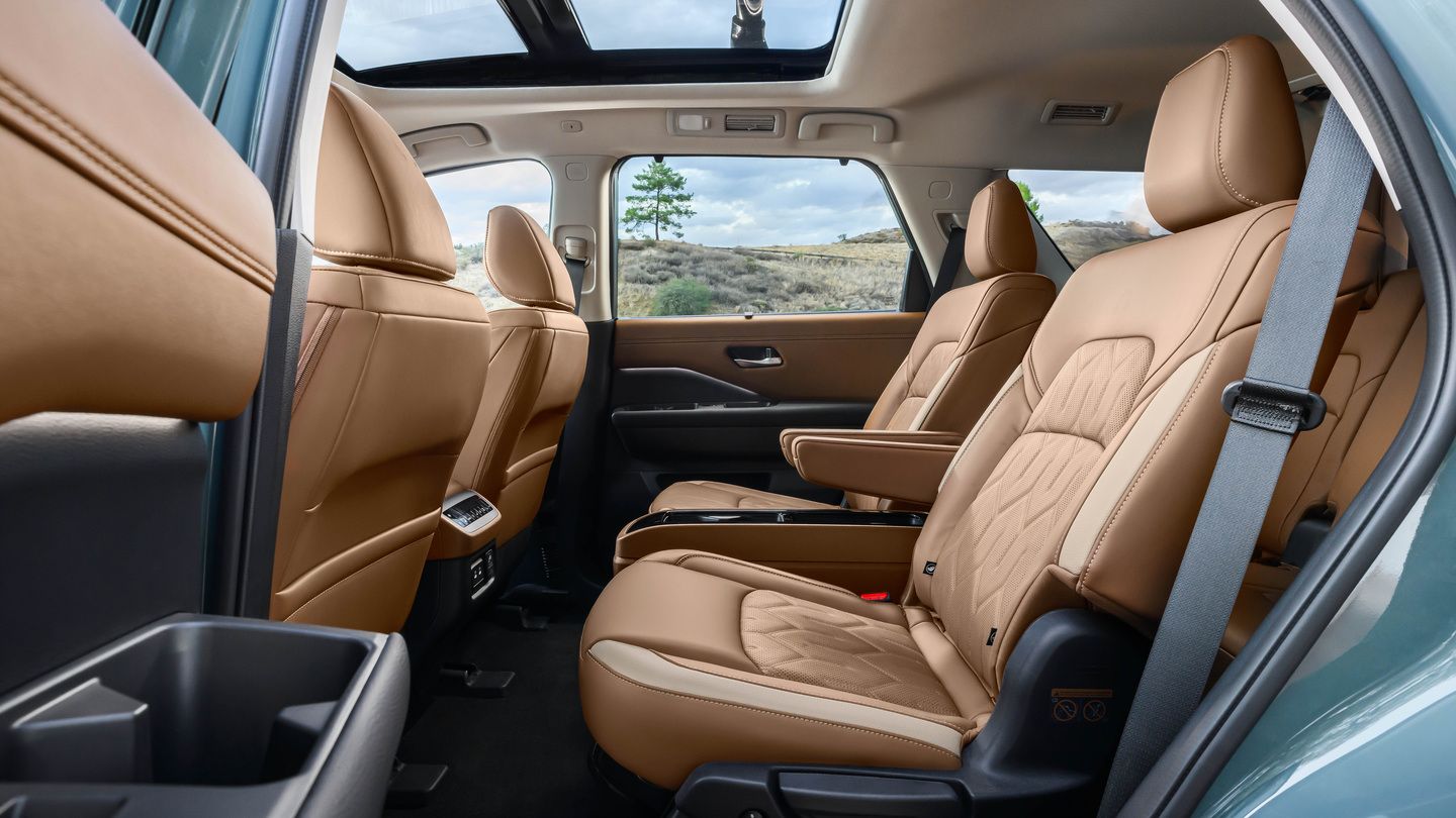 Pathfinder accommodates up to eight passengers across three rows, or seven with the available captain's chairs in Platinum grade. The second row features Nissan's LATCH AND GLIDE technology, allowing the seats to tip and slide forward for third-row access even with a child safety seat installed.